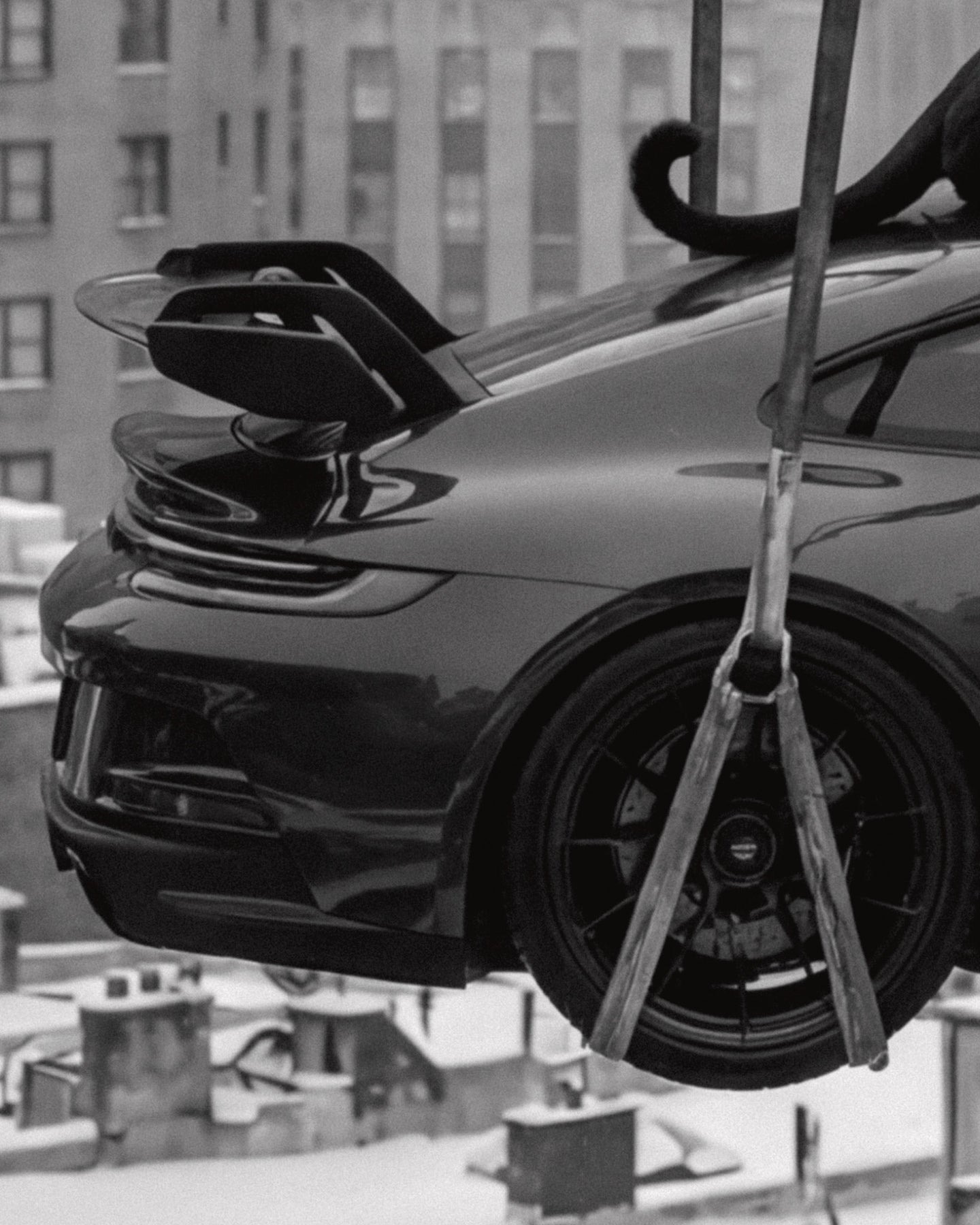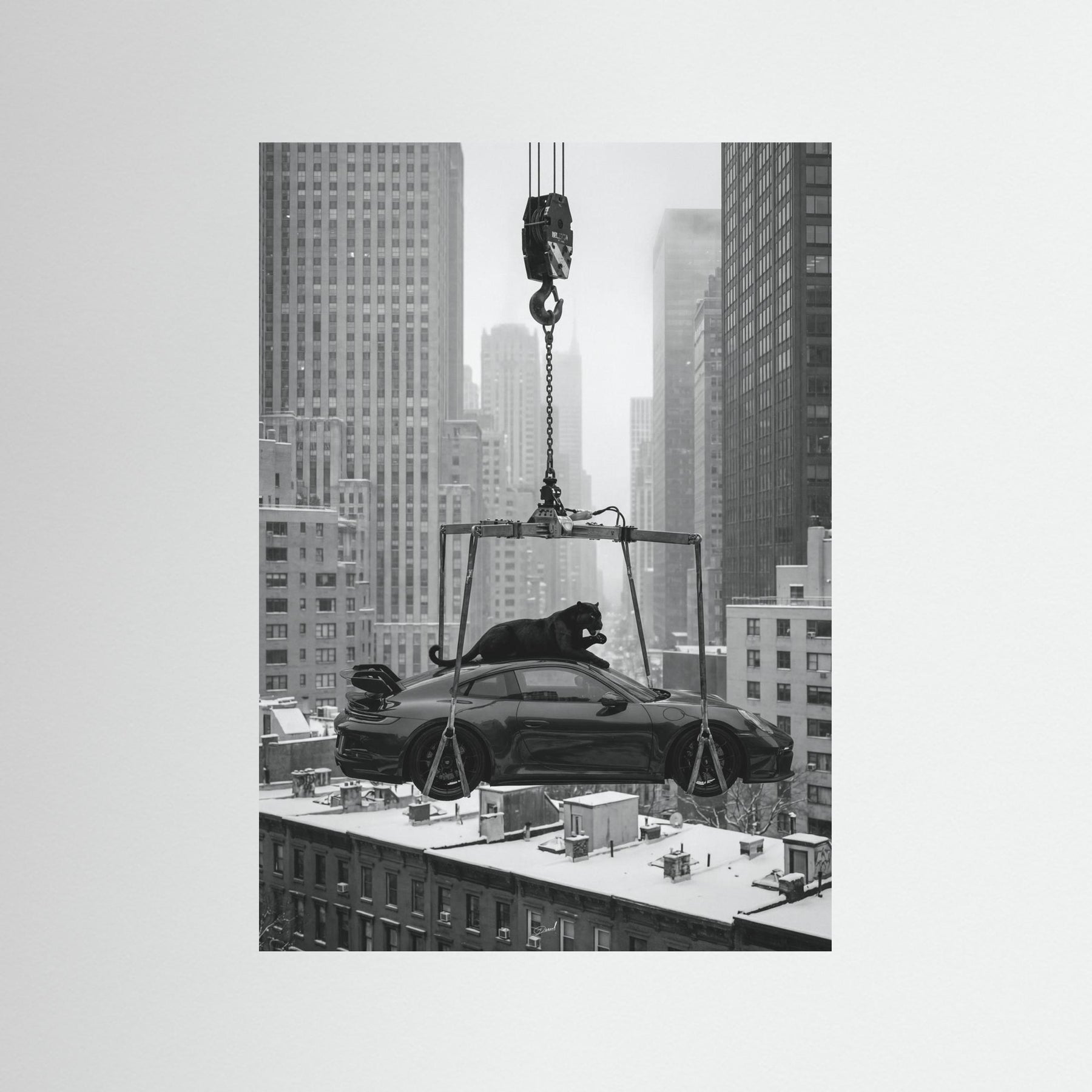 Ein Fahrzeug hängt über der Stadt wie ein Artefakt zwischen Himmel und Architektur. Die Szene wirkt unmöglich und zugleich präzise. Urbaner Raum wird zur Bühne, Technik zur Skulptur, Realität zur Inszenierung.