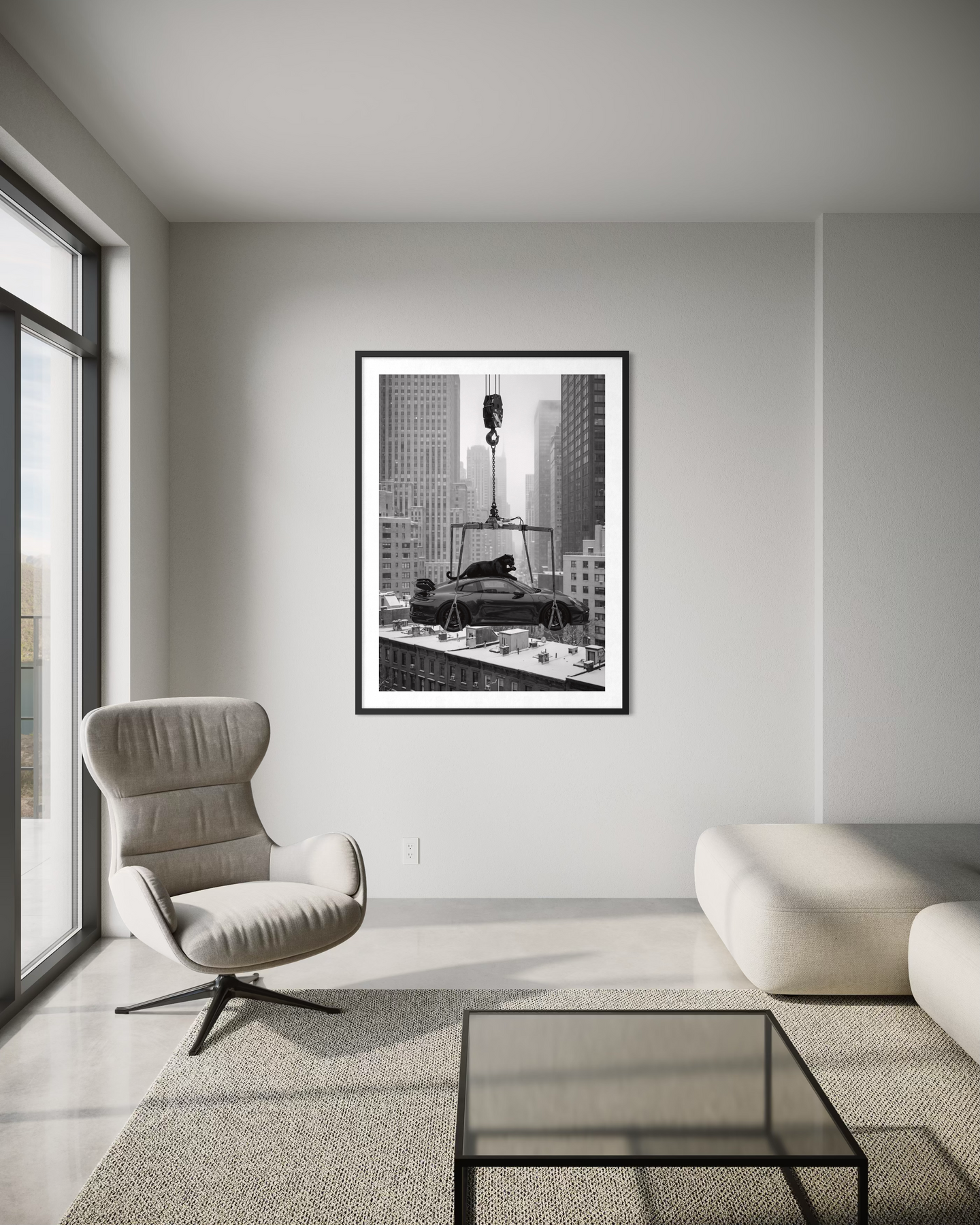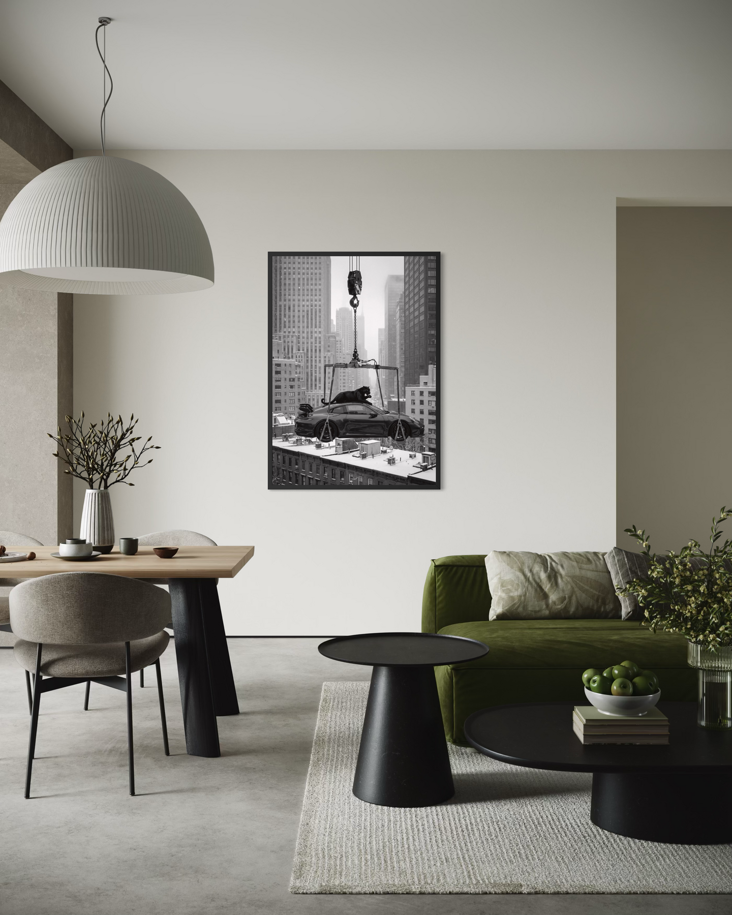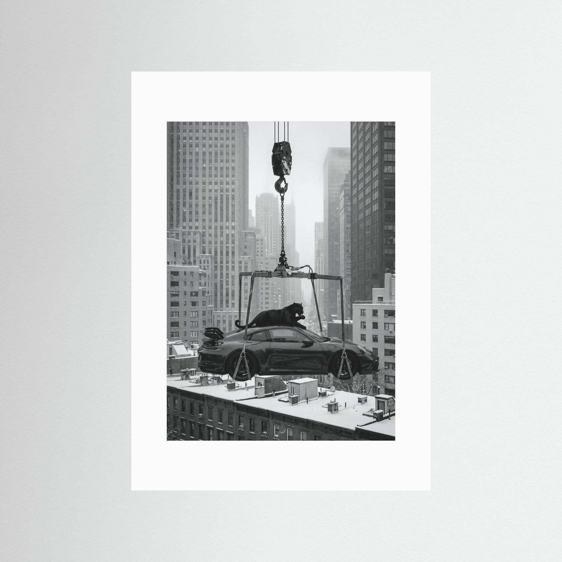 Dieses Fine Art Print zeigt die Stadt nicht als Ort, sondern als Zustand. Das schwebende Fahrzeug wirkt wie eine Intervention in die Logik des Alltags. Die Szene erzählt von Fortschritt als Inszenierung, von Architektur als Kulisse und von Technik als ästhetischer Eingriff in das Gefüge der Realität.