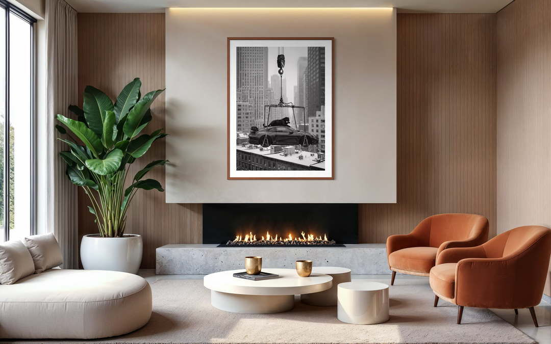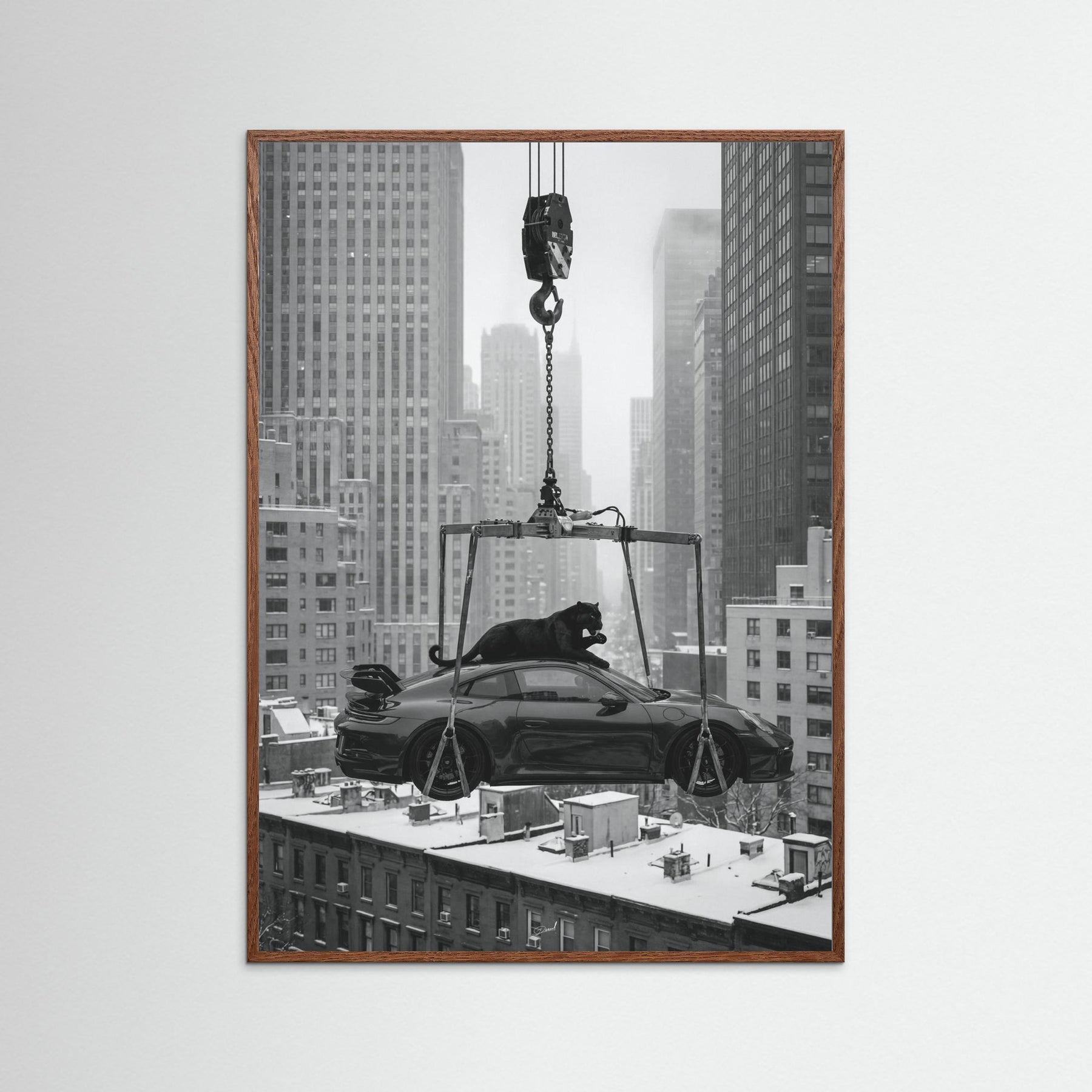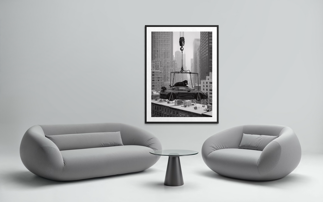 Dieses Fine Art Print zeigt die Stadt nicht als Ort, sondern als Zustand. Das schwebende Fahrzeug wirkt wie eine Intervention in die Logik des Alltags. Die Szene erzählt von Fortschritt als Inszenierung, von Architektur als Kulisse und von Technik als ästhetischer Eingriff in das Gefüge der Realität.