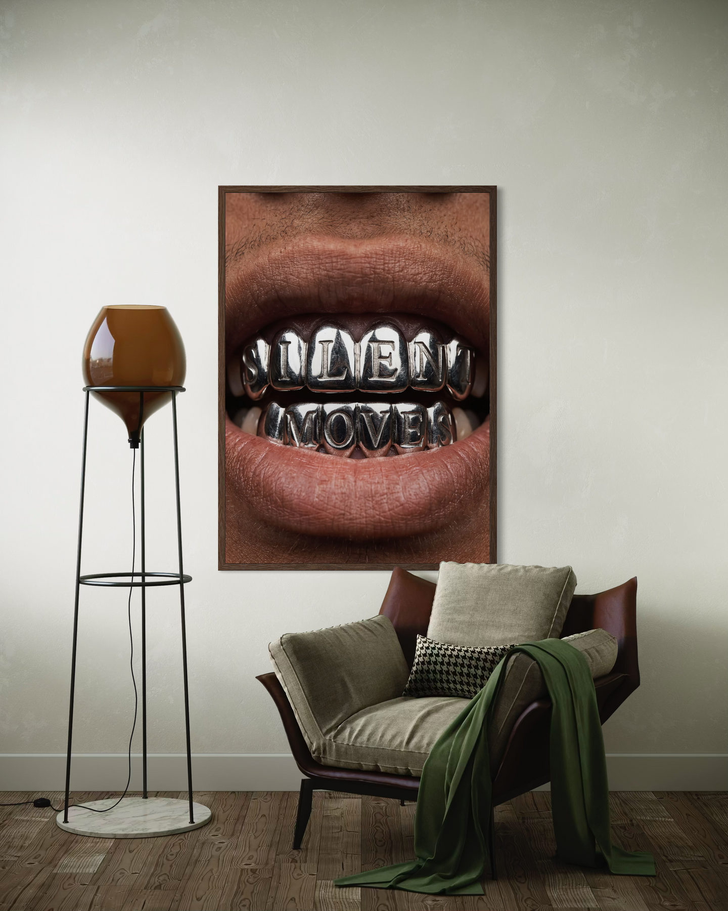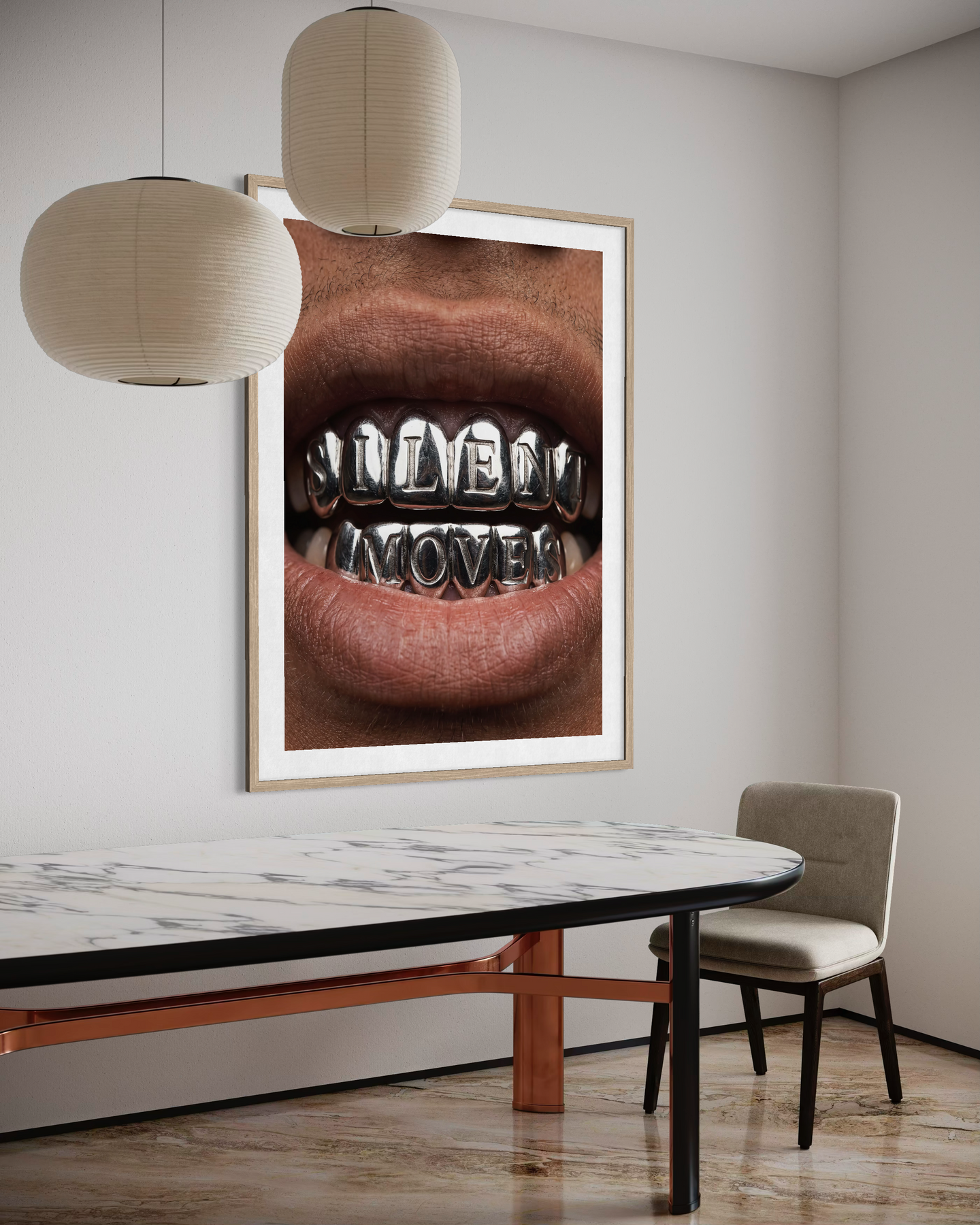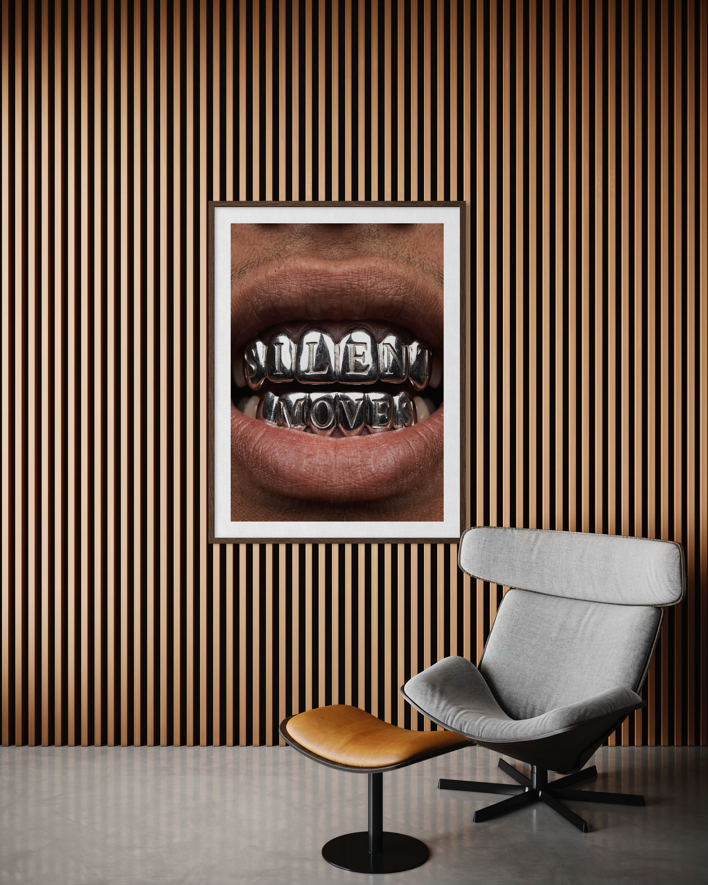 Die glänzenden Lettern verwandeln den Mund in ein Manifest. Kommunikation wird hier nicht flüchtig, sondern dauerhaft. Das Werk spielt mit Macht, Identität und Selbstbestimmung. Der Ausdruck wirkt konfrontativ und zugleich kontrolliert. Es geht um Präsenz im Jetzt – um den Moment, der nicht erklärt, sondern eingefordert wird.