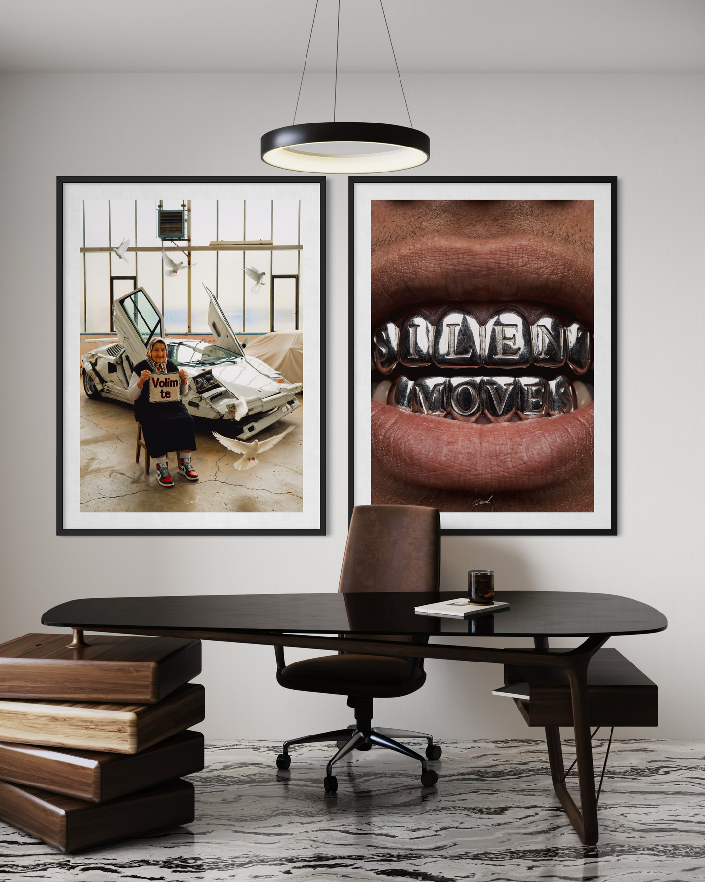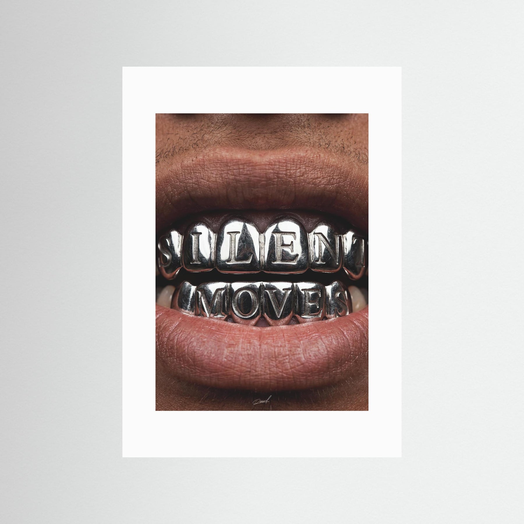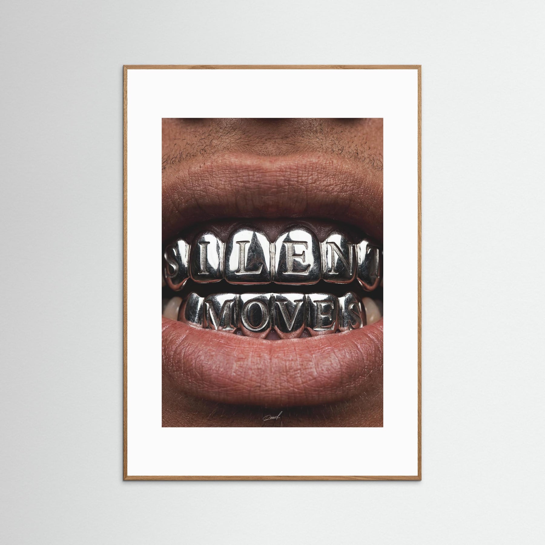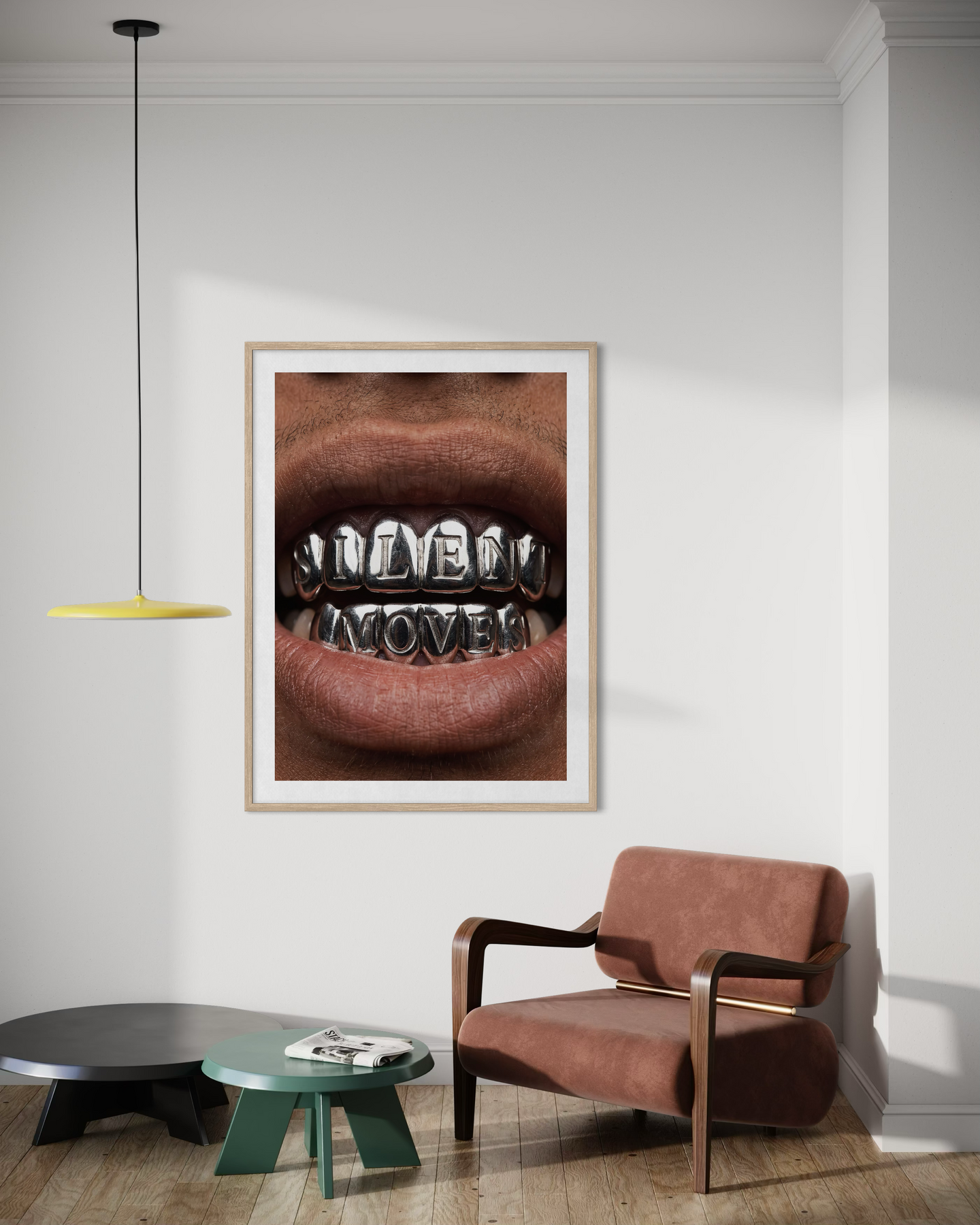 Die glänzenden Lettern verwandeln den Mund in ein Manifest. Kommunikation wird hier nicht flüchtig, sondern dauerhaft. Das Werk spielt mit Macht, Identität und Selbstbestimmung. Der Ausdruck wirkt konfrontativ und zugleich kontrolliert. Es geht um Präsenz im Jetzt – um den Moment, der nicht erklärt, sondern eingefordert wird.
