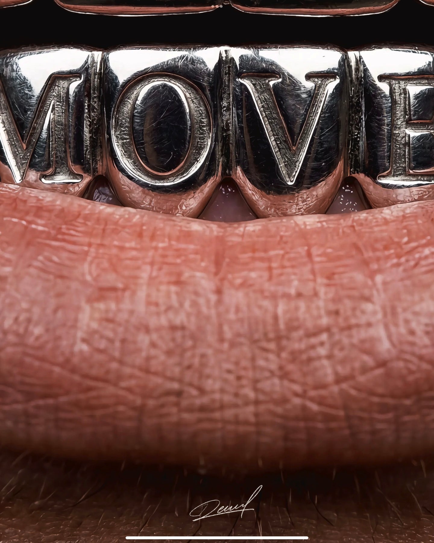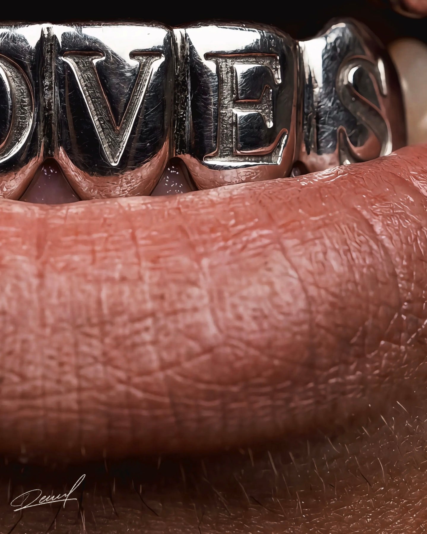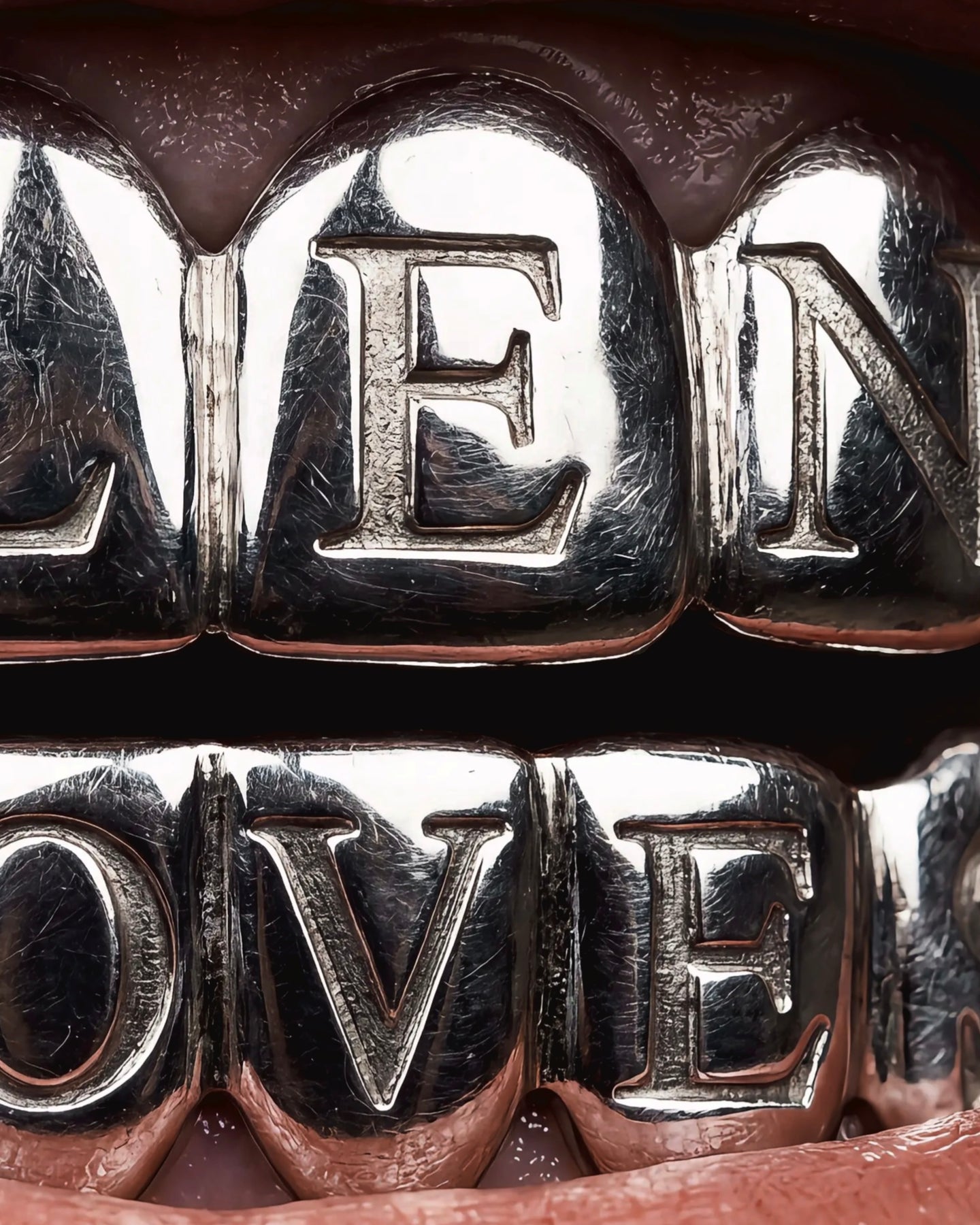 Das Kunstwerk zeigt einen Mund, dessen Zähne zu einer Botschaft werden. Metall trifft auf Haut, Sprache wird physisch. Der Moment wirkt direkt, roh und unumgänglich als würde Bedeutung nicht gesprochen, sondern getragen.