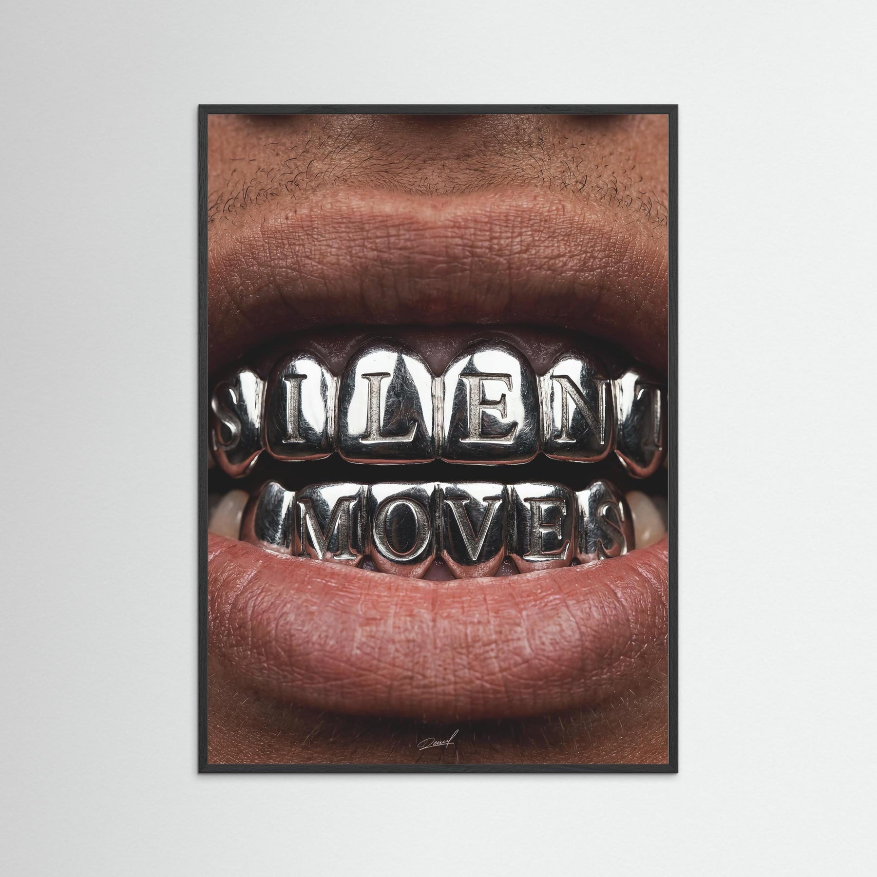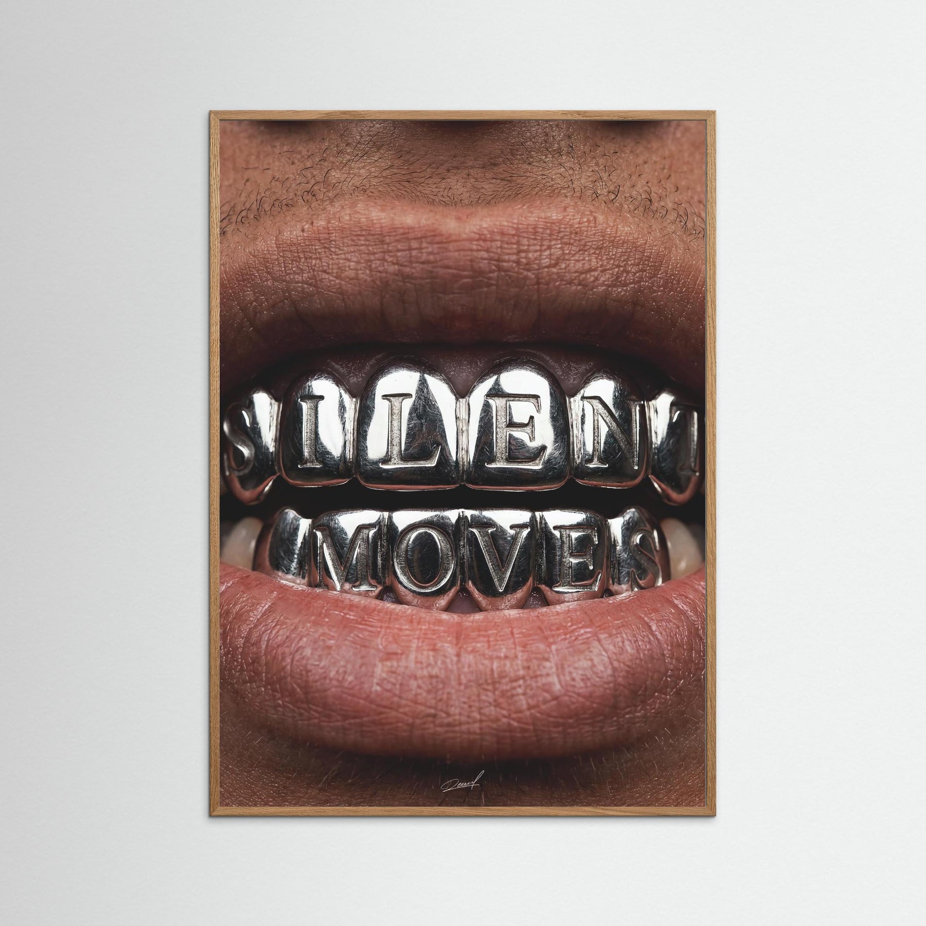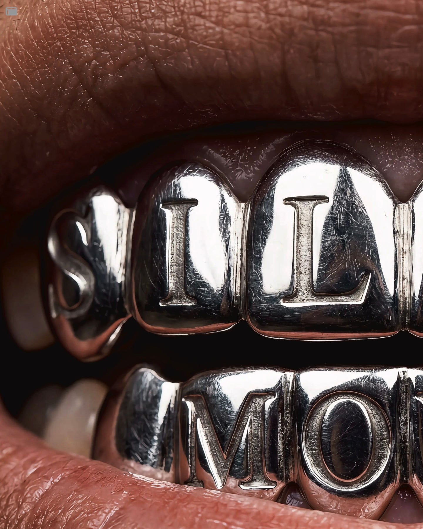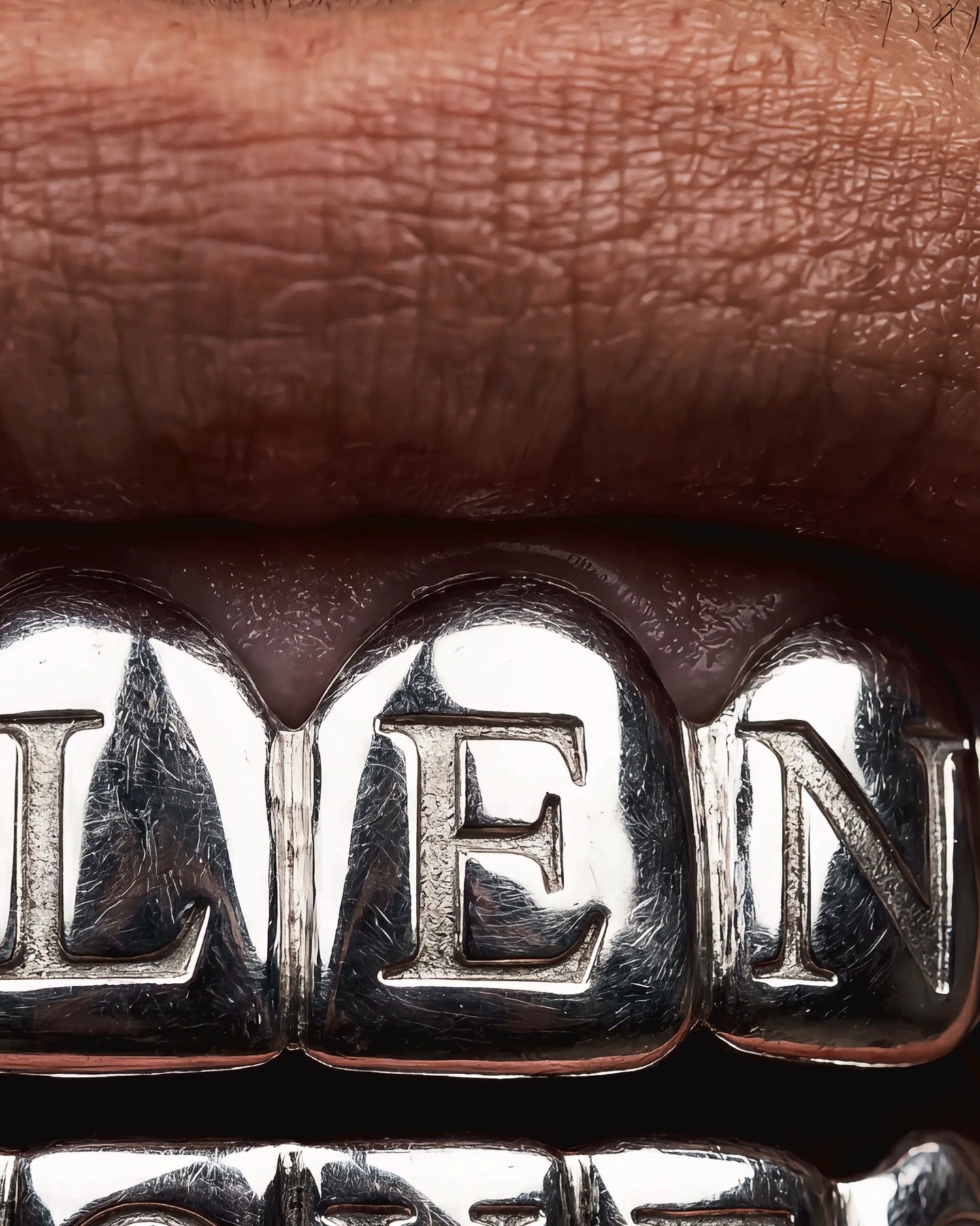 Das Kunstwerk zeigt einen Mund, dessen Zähne zu einer Botschaft werden. Metall trifft auf Haut, Sprache wird physisch. Der Moment wirkt direkt, roh und unumgänglich als würde Bedeutung nicht gesprochen, sondern getragen.